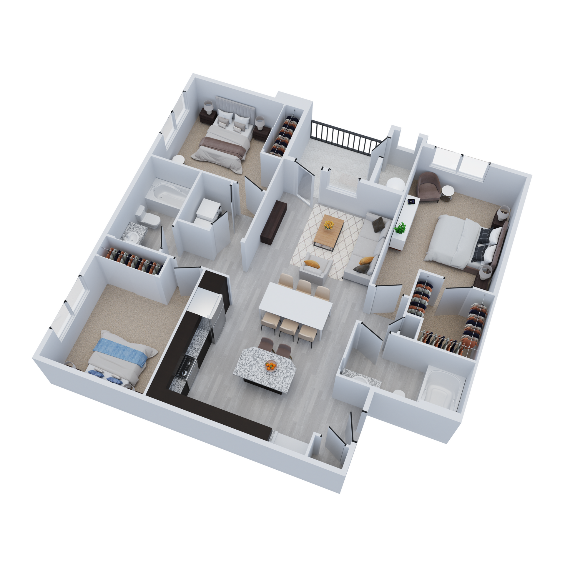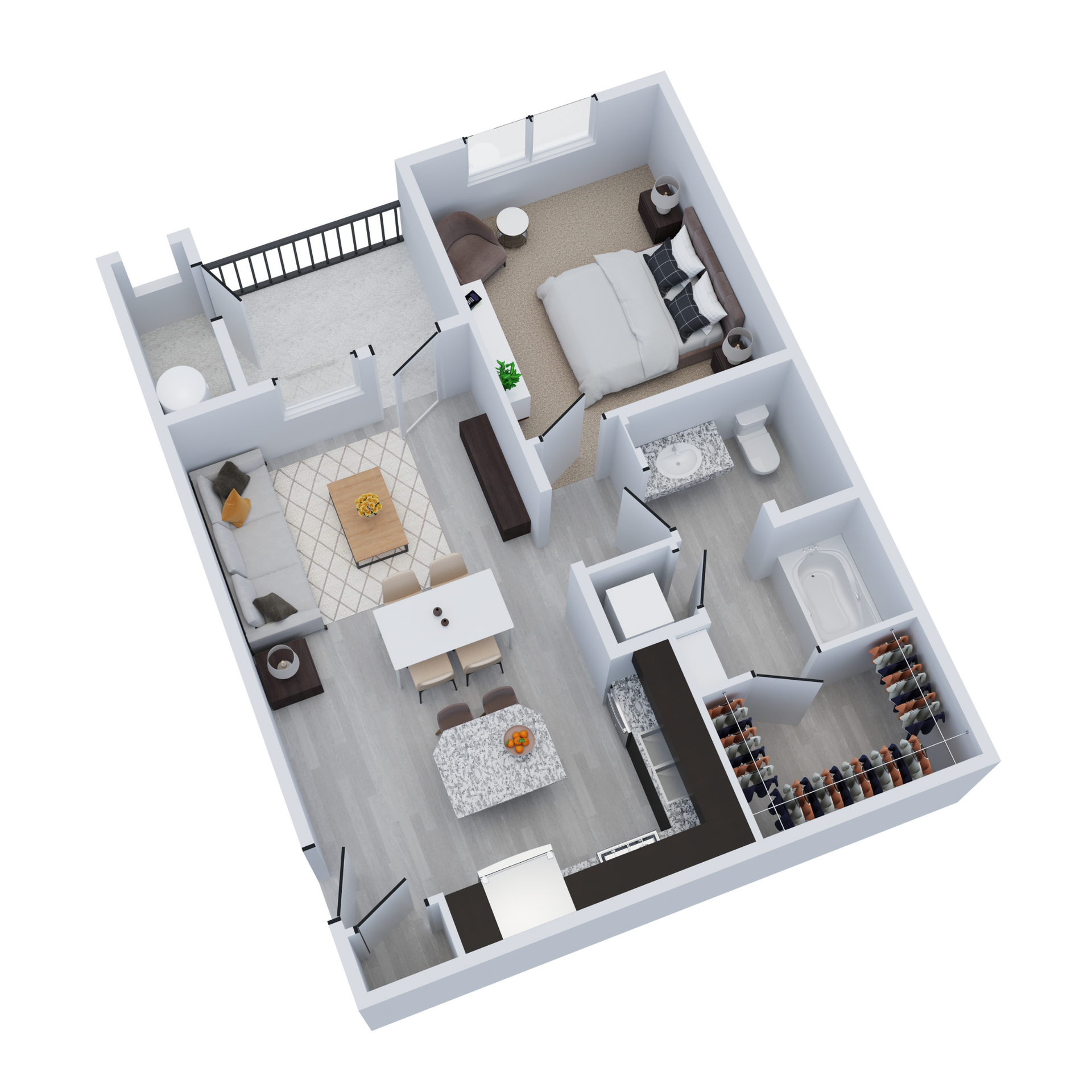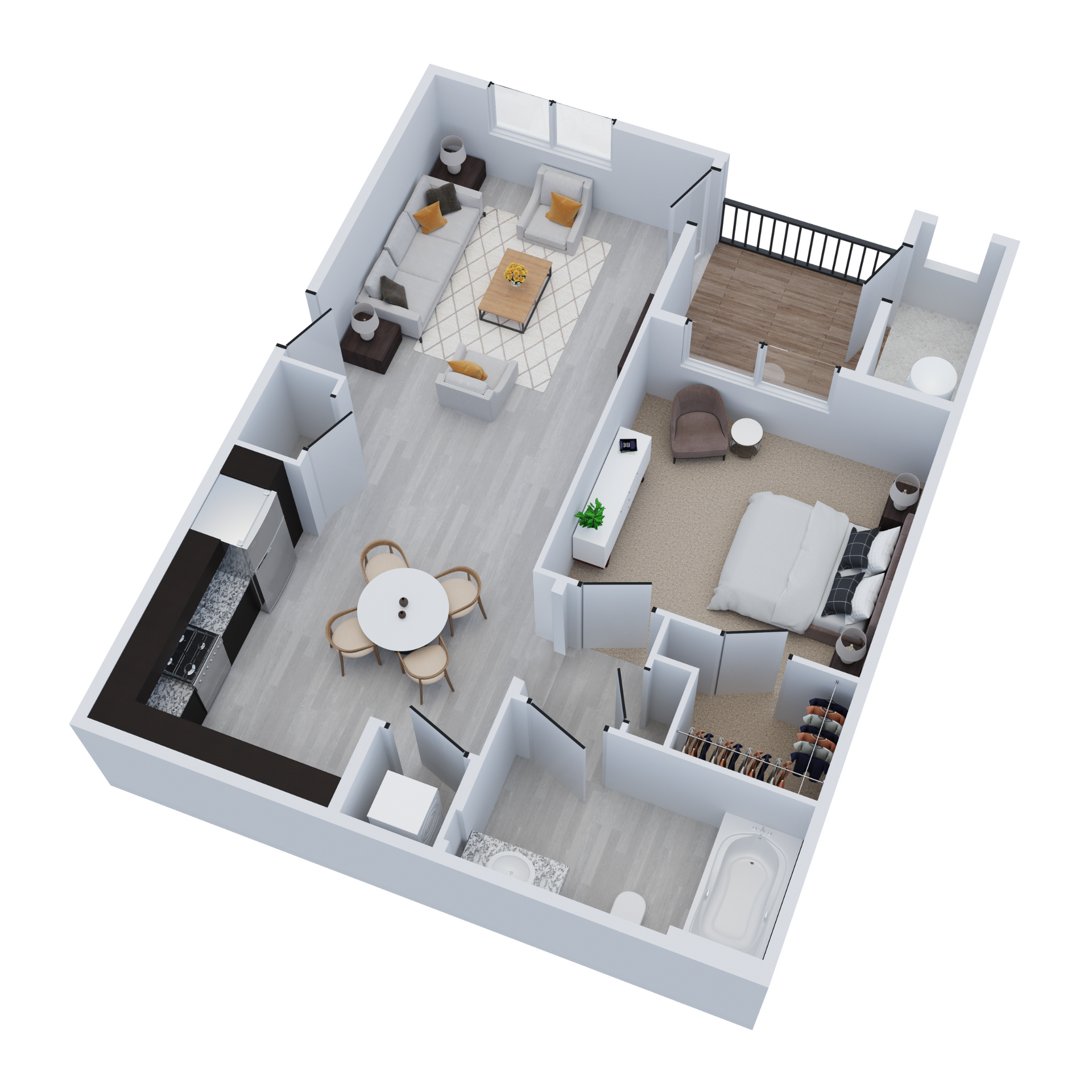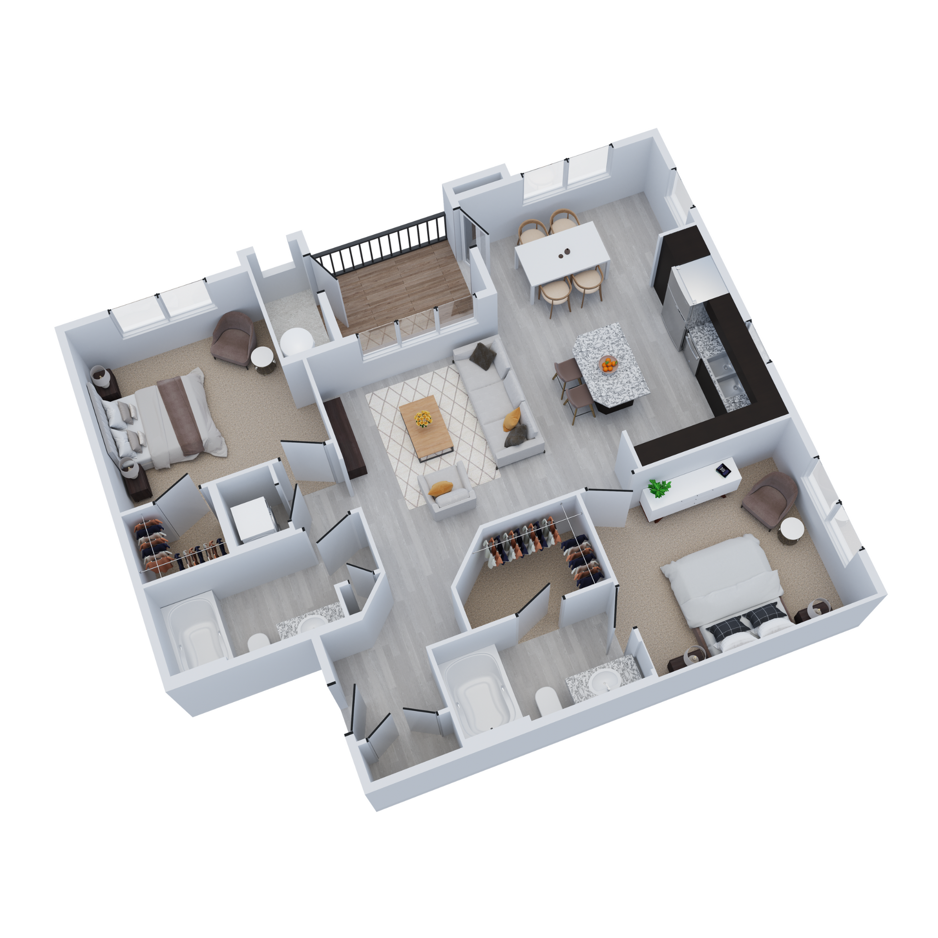 As you enter your new home, you’ll be impressed by an array of elegant finishes, from luxury plank vinyl flooring in the living areas to slab granite countertops in the kitchen and bathrooms. Your cooking space also comes completely equipped with stainless-steel appliances, including a French-door refrigerator and a glass-top stove.